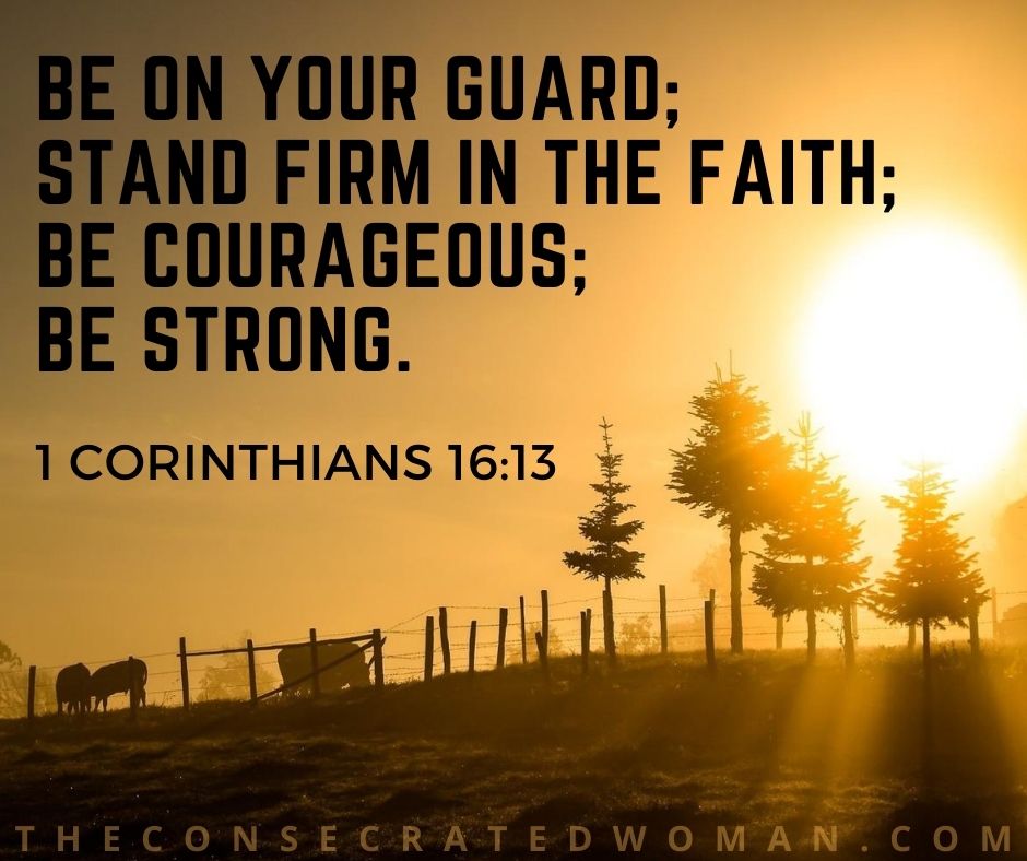 Whether you realize it or not, the enemy, the ruler of darkness and evil is constantly waging spiritual battles against you and you never know what the new day may bring. Be vigilant and always on guard, consciously abstaining from sin. Stand firm in your beliefs, in the doctrine and true Word of God. Be brave and courageous as a soldier in God’s army knowing that through Christ the victory is already yours. Start each day with prayer asking the Lord to be with you and to give you courage and strength to face whatever comes your way.