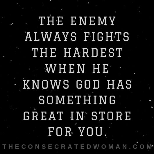 We each fight spiritual battles every day. Discouragement, anger, stress and defeat are just some of the enemy’s tactics as he tries to bring you down. When the devil sees that God has something great for you just around the corner he will fight his hardest to keep you from what God has in store for you. Be alert and recognize his schemes so you don’t fall into his traps. Arm yourself with spiritual weapons, the Word of God and prayer. We will not win the war against evil by our own strength but by the power of the mighty God we serve. Whatever you are battling today remember that God is on your side and you are more than a conqueror through Christ.