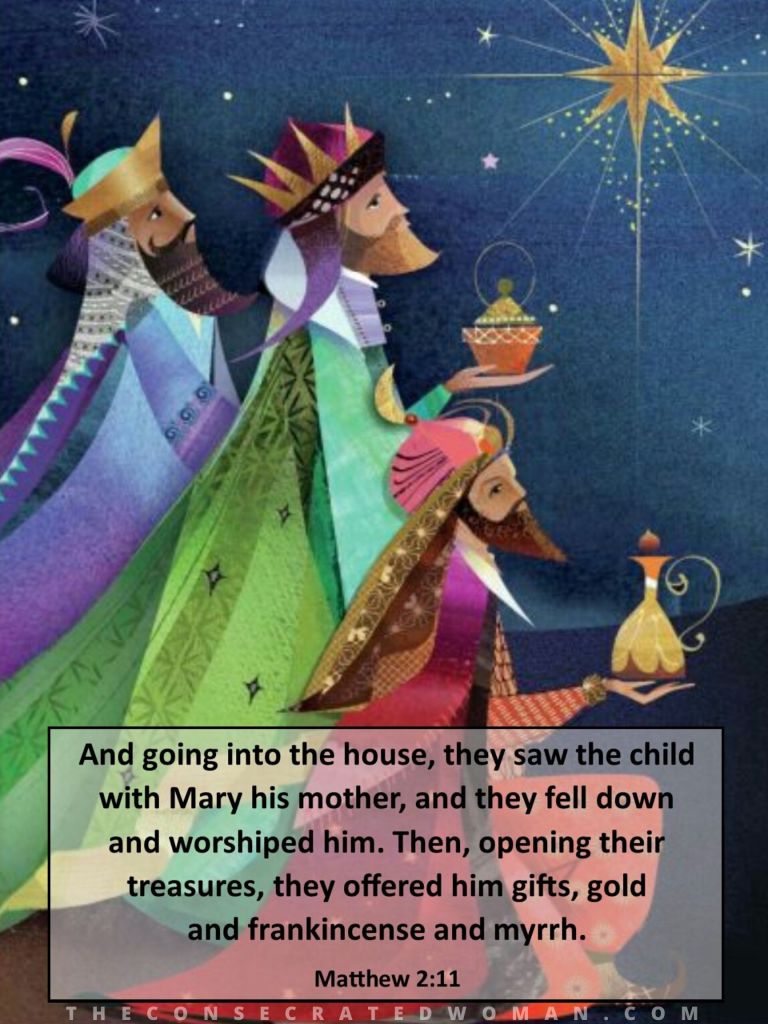 The magi, also referred to as the (Three) Wise Men or (Three) Kings, had followed the star to Jerusalem and when they arrived they asked, “Where is the one who has been born king of the Jews?” Upon finding Jesus they fell down and worshiped Him bestowing Him honor and acknowledging Him as King. After they worshiped Him they presented their gifts. The three gifts they brought had significant spiritual meaning. They gave Him gold, a gift for royalty, which represents His Kingship. Second, they gave Him frankincense, a symbol of His priestly role and mediator between God and man. And finally, they gave Him myrrh, a burial ointment because Jesus was the Savior who came to die for our sins. Like the magi we can come to Jesus and worship Him and offer Him the gifts of our heart, talent and service.