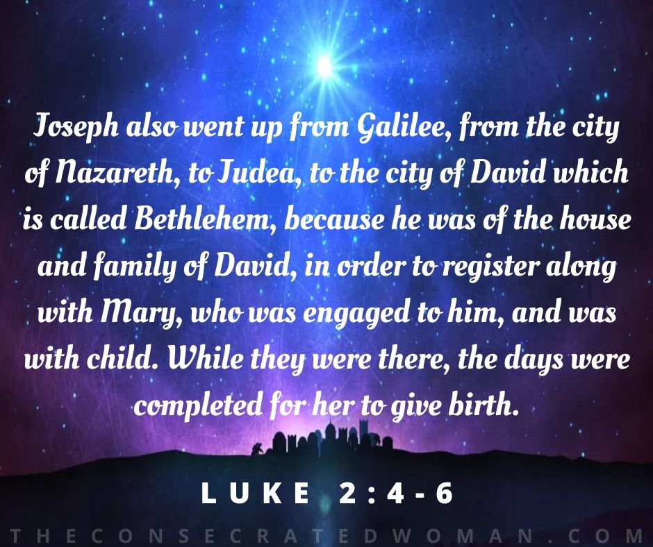 Joseph also went up from Galilee, from the city of Nazareth, to Judea, to the city of David which is called Bethlehem, because he was of the house and family of David, in order to register along with Mary, who was engaged to him, and was with child. While they were there, the days were completed for her to give birth.
