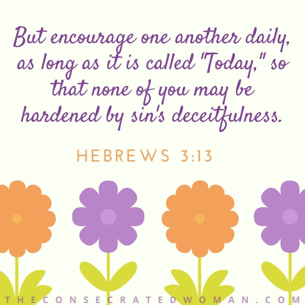 But encourage one another daily, as long as it is called “Today,” so that none of you may be hardened by sin’s deceitfulness.