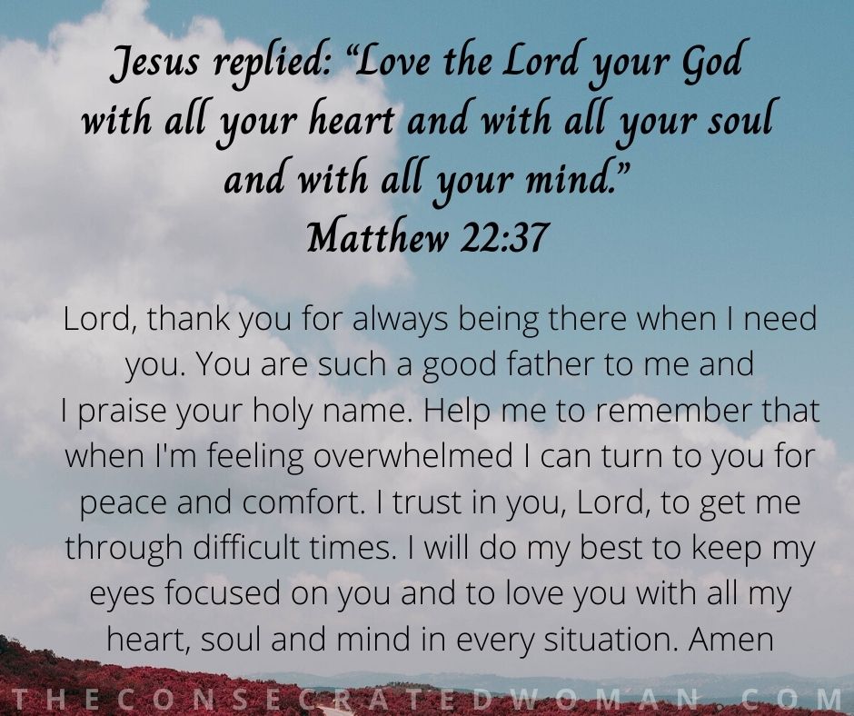 Lord, thank you for always being there when I need you. You are such a good father to me and I praise your holy name. Help me to remember that when I’m feeling overwhelmed I can turn to you for peace and comfort. I trust in you, Lord, to get me through difficult times. I will do my best to keep my eyes focused on you and to love you with all my heart, soul and mind in every situation. Amen