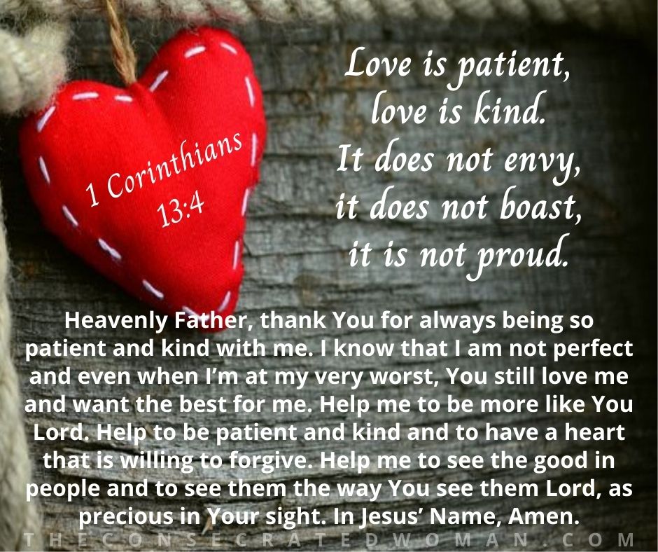 Heavenly Father, thank You for always being so patient and kind with me. I know that I am not perfect and even when I’m at my very worst, You still love me and want the best for me. Help me to be more like You Lord. Help to be patient and kind and to have a heart that is willing to forgive. Help me to see the good in people and to see them the way You seem them Lord, as precious in Your sight. In Jesus’ Name, Amen.