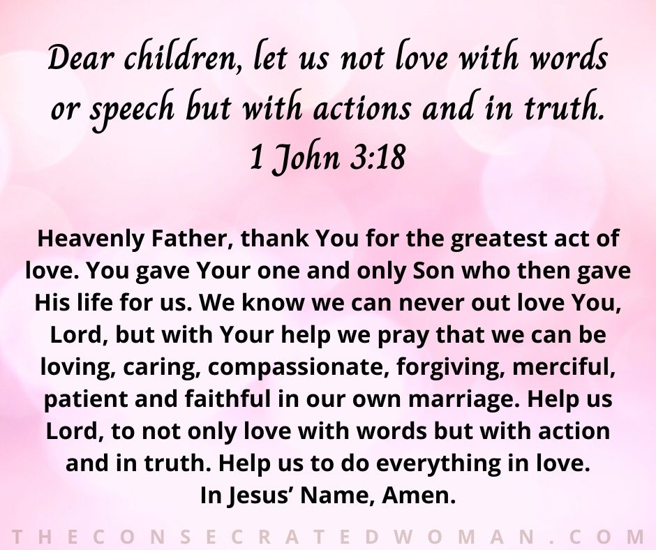 Heavenly Father, thank You for the greatest act of love. You gave Your one and only Son who then gave His life for us. We know we can never out love You, Lord, but with Your help we pray that we can be loving, caring, compassionate, forgiving, merciful, patient and faithful in our own marriage. Help us Lord, to not only love with words but with action and in truth. Help us to do everything in love. In Jesus’ Name, Amen.