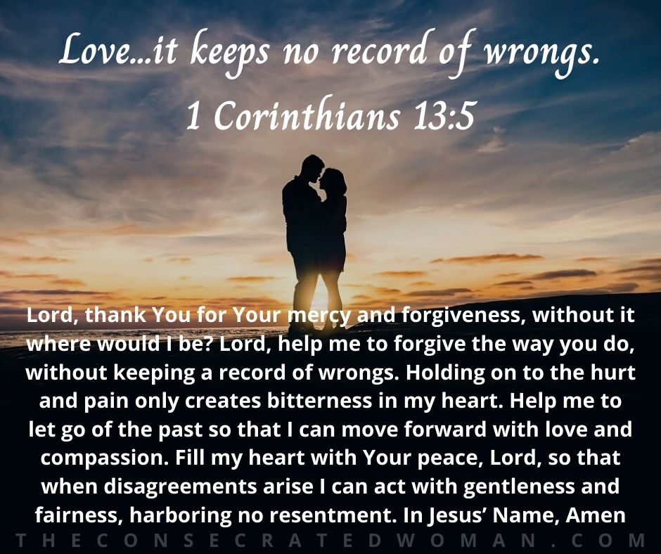We’re not perfect and there are going to be times when we disagree or have conflict but love fights fair and it doesn’t keep score. It doesn’t bring up the past and it doesn’t use the past to purposefully hurt each other. Love listens before speaking, is gentle and fair. Love tries to understand and love forgives. Forgive and forget the mistake but remember the lesson so you can keep growing. Holding on to the past only keeps you from moving forward. Keeping a record of wrongs creates a bitter heart and a bitter heart can find no peace.