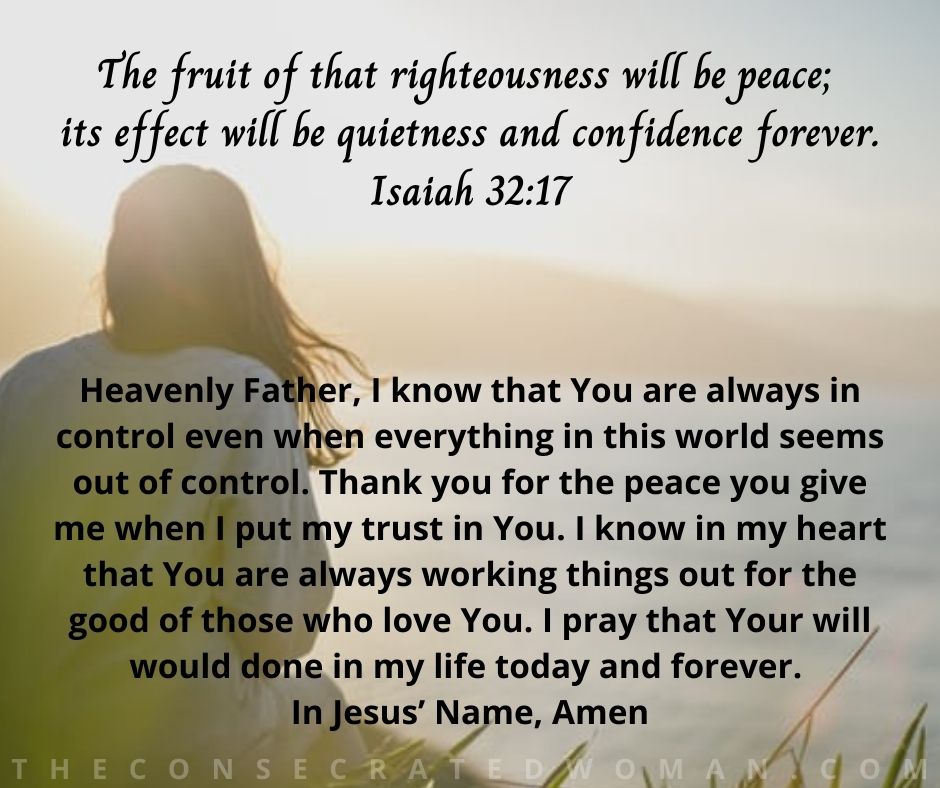 Heavenly Father, I know that You are always in control even when everything in this world seems out of control. Thank you for the peace you give me when I put my trust in You. I know in my heart that You are always working things out for the good of those who love You. I pray that Your will would done in my life today and forever. In Jesus’ Name, Amen