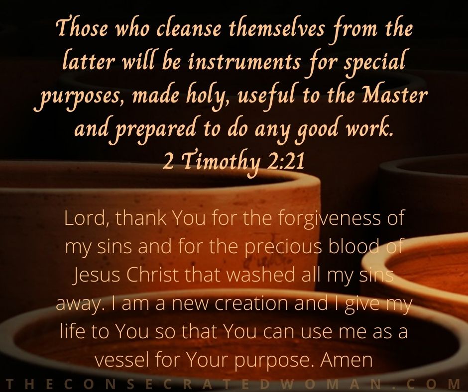 Lord, thank You for the forgiveness of my sins and for the precious blood of Jesus Christ that washed all my sins away. I am a new creation and I give my life to You so that You can use me as a vessel for Your purpose. Amen