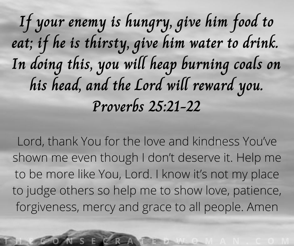 Have you ever heard the expression “kill them with kindness”? It means to put an end to anger and bitterness by showing kindness and generosity. As metals are melted by heaping coals upon them, so is the heart softened by kindness. (Jamieson-Fausset-Brown Bible Commentary) The more you treat your enemy with unexpected kindness and generosity the more they will see the same love, forgiveness, mercy and grace that the Lord shows you. Show kindness even to people who don’t deserve it, not as a reflection of their character but as a reflection of yours.