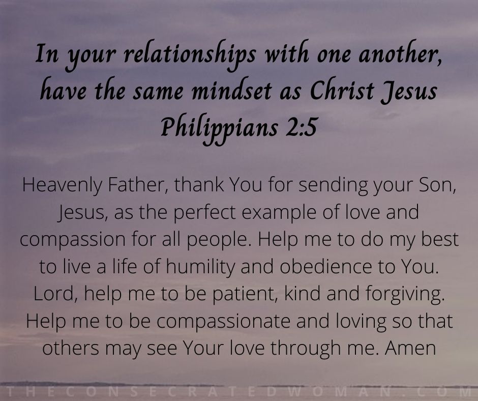 In everything you do and as you interact with people, follow the example of Jesus Christ. Make a conscious effort to have the same mindset as the Lord. Before you speak, before you act, ask yourself how would Jesus handle this situation. In the 90s the phrase “What Would Jesus Do?” (WWJD) became popular and served as a reminder to act in a way that demonstrates the character of Jesus. The Bible tells us that Jesus was humble, obedient, patient, giving, forgiving and more. Jesus not only loved God but His heart was full of love and compassion for all people. Do your best to live your life in such a way that others will see Jesus in you.