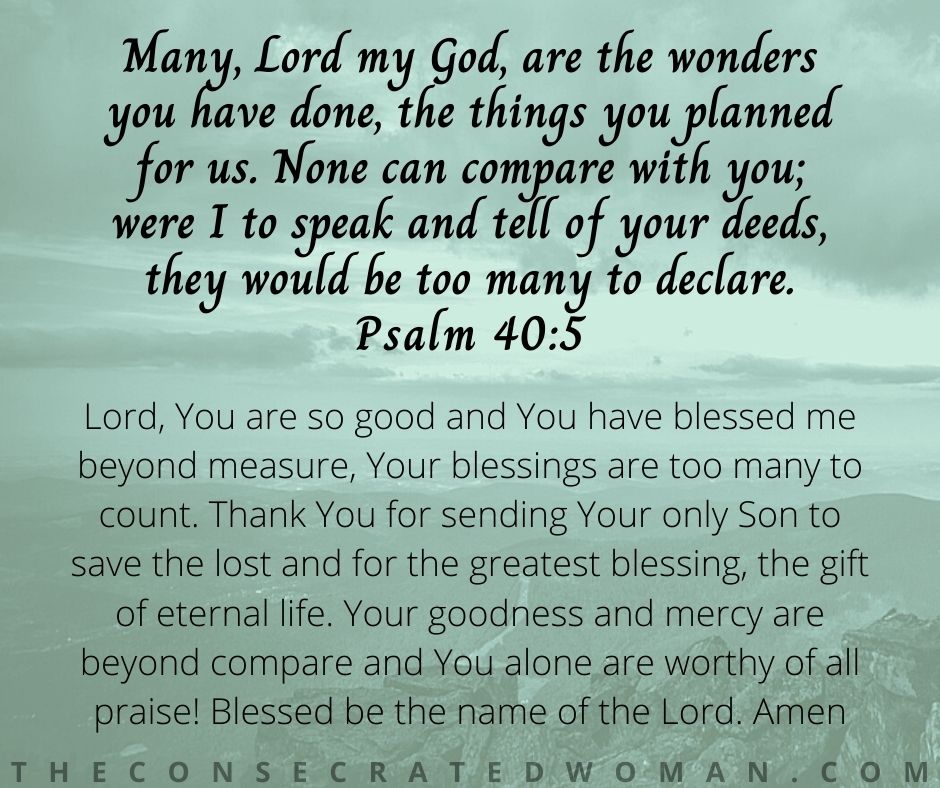Many, Lord my God, are the wonders you have done, the things you planned for us. None can compare with you; were I to speak and tell of your deeds, they would be too many to declare.