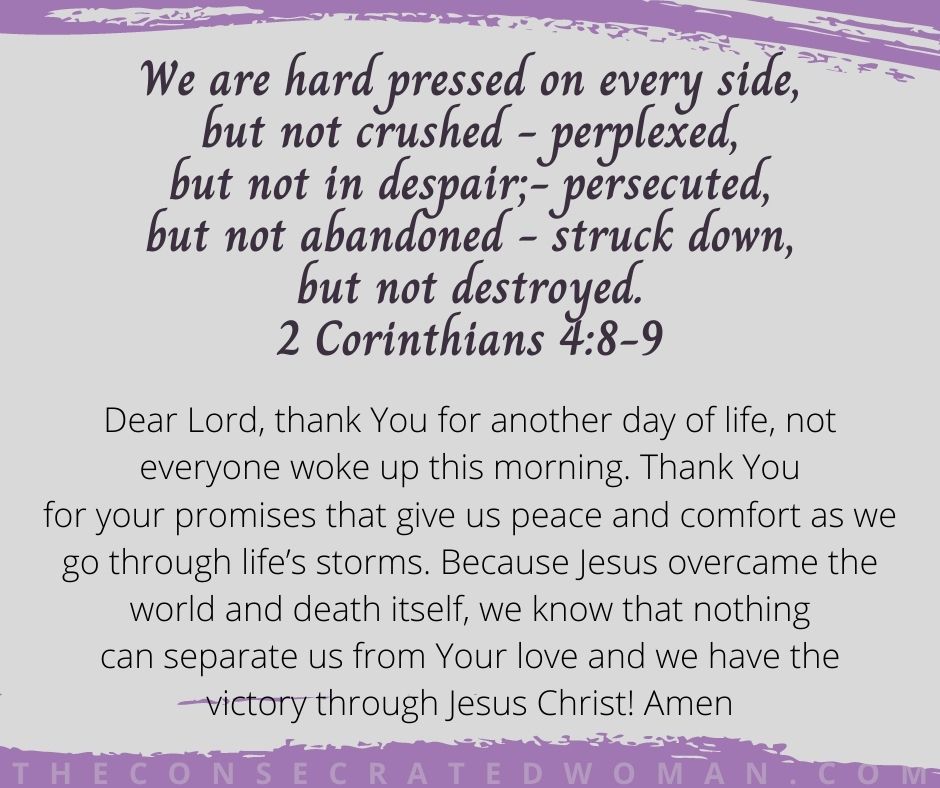 Dear Lord, thank You for another day of life, not everyone woke up this morning. Thank You for your promises that give us peace and comfort as we go through life’s storms. Because Jesus overcame the world and death itself, we know that nothing can separate us from Your love and we have the victory through Jesus Christ! Amen