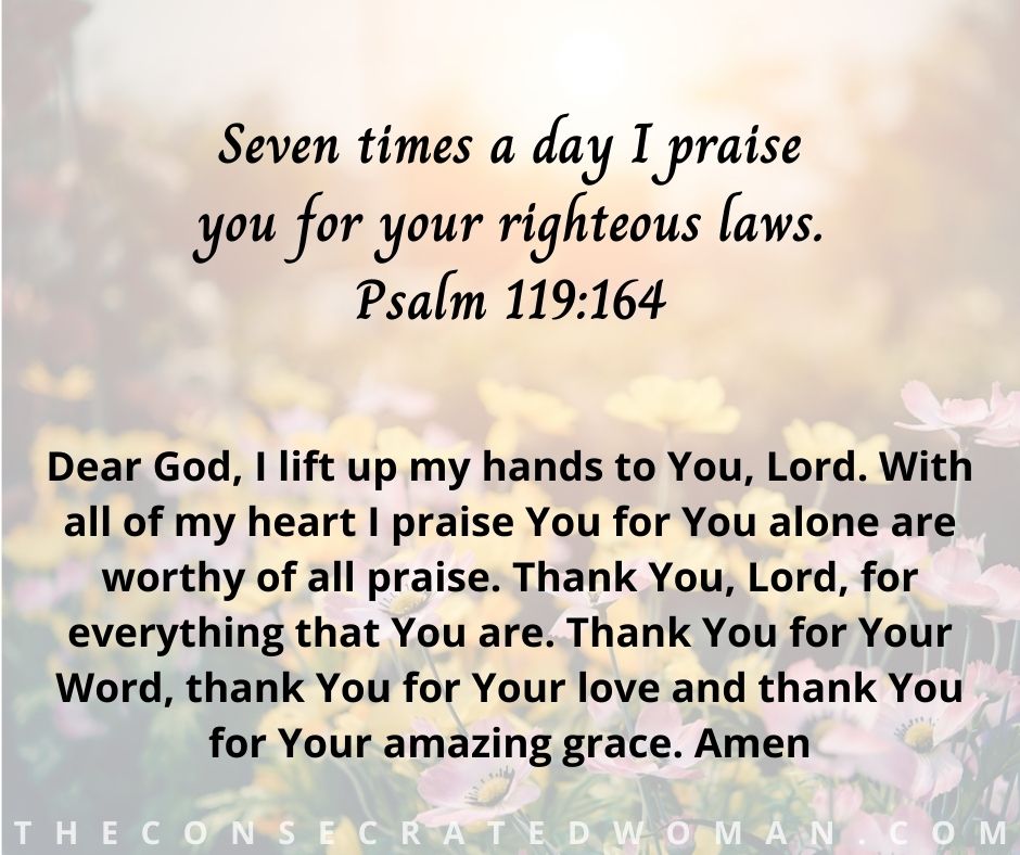 There is no set number of times a day we must praise God each day but wouldn’t it be wonderful if we just stopped what we were doing throughout the day to delight and please God with our praise, to give thanks and honor to the one who is worthy of all praise? We have so much to be thankful for and it doesn’t take but a few moments to say, “Thank you God!” It doesn’t even matter what we are going though, even in difficult times, through faith we can still lift up our hands to praise our God. Praise God with your words and with your songs, give God all the glory!