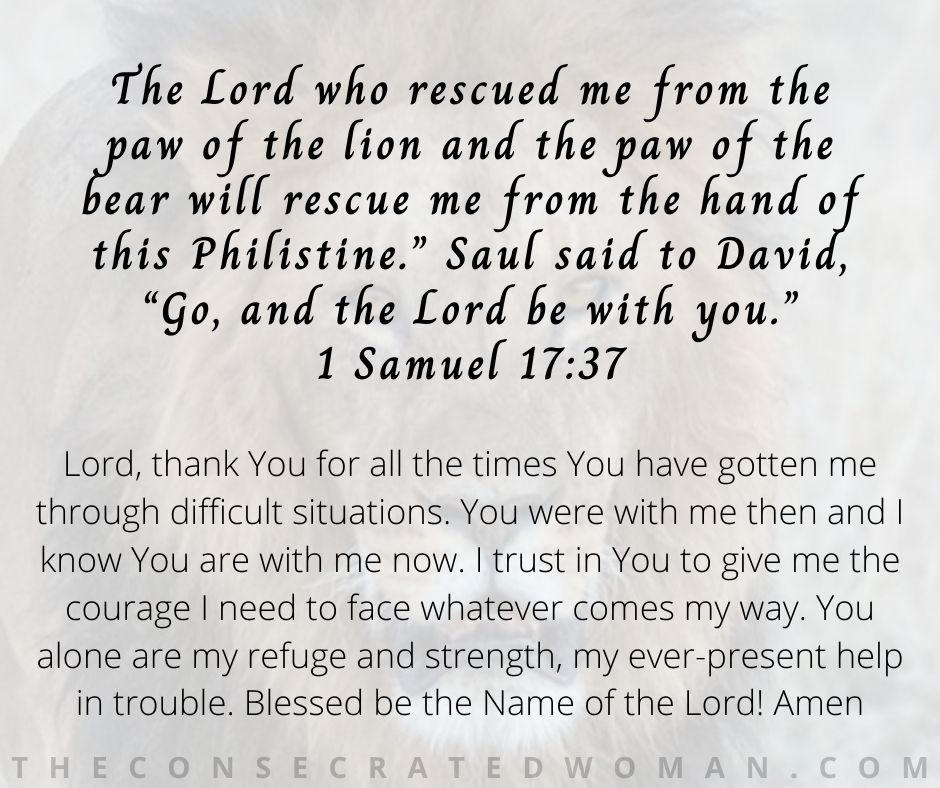 You may be going through adversity at this very moment, but you can still have courage in your current situation. Just like the Lord rescued David from the paw of the lion earlier, David believed that God would also rescue him from this new situation. The same is true for you. God brought you through difficult times before, and He’ll do it again. God was with you then and He’s with you now. Instead of worrying about your present circumstances, remember the times God brought you through the storms. Thank God for all that tribulations He’s brought you through and thank Him in advance for getting you through whatever is going on in your life right now.