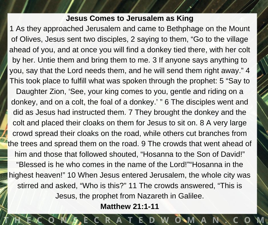1 As they approached Jerusalem and came to Bethphage on the Mount of Olives, Jesus sent two disciples, 2 saying to them, “Go to the village ahead of you, and at once you will find a donkey tied there, with her colt by her. Untie them and bring them to me. 3 If anyone says anything to you, say that the Lord needs them, and he will send them right away.” 4 This took place to fulfill what was spoken through the prophet: 5 “Say to Daughter Zion, ‘See, your king comes to you, gentle and riding on a donkey, and on a colt, the foal of a donkey.’ ” 6 The disciples went and did as Jesus had instructed them. 7 They brought the donkey and the colt and placed their cloaks on them for Jesus to sit on. 8 A very large crowd spread their cloaks on the road, while others cut branches from the trees and spread them on the road. 9 The crowds that went ahead of him and those that followed shouted, “Hosanna to the Son of David!” “Blessed is he who comes in the name of the Lord!”“Hosanna in the highest heaven!” 10 When Jesus entered Jerusalem, the whole city was stirred and asked, “Who is this?” 11 The crowds answered, “This is Jesus, the prophet from Nazareth in Galilee.”