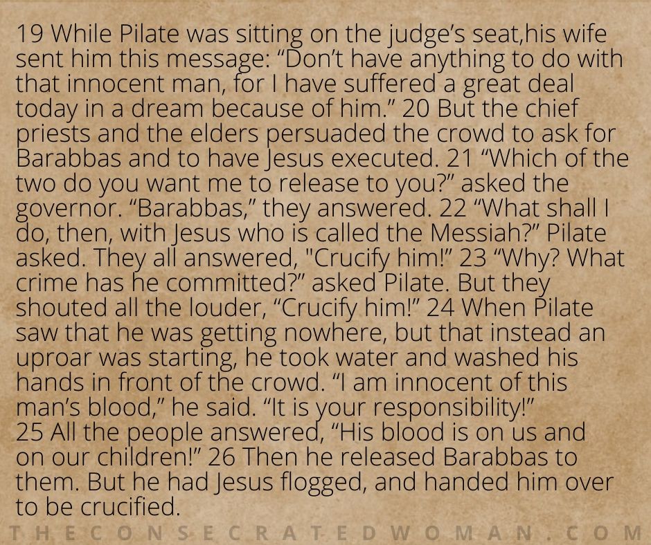 24 When Pilate saw that he was getting nowhere, but that instead an uproar was starting, he took water and washed his hands in front of the crowd. “I am innocent of this man’s blood,” he said. “It is your responsibility!” 25 All the people answered, “His blood is on us and on our children!” 26 Then he released Barabbas to them. But he had Jesus flogged, and handed him over to be crucified.
