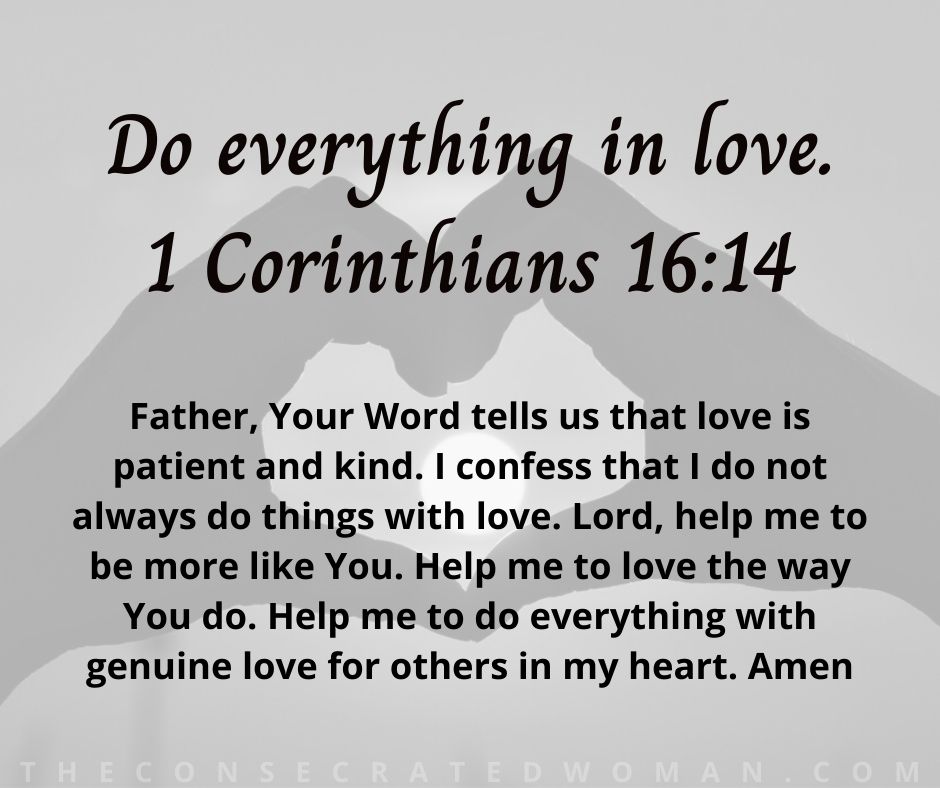 Father, Your Word tells us that love is patient and kind. I confess that I do not always do things with love. Lord, help me to be more like You. Help me to love the way You do. Help me to do everything with genuine love for others in my heart. Amen