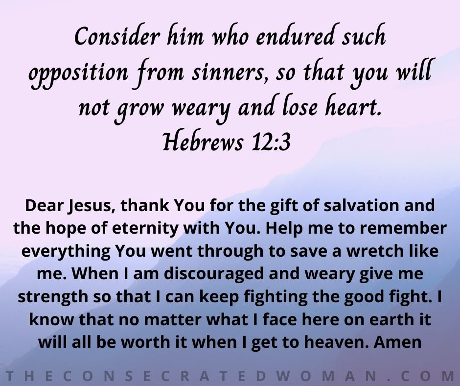 Dear Jesus, thank You for the gift of salvation and the hope of eternity with You. Help me to remember everything You went through to save a wretch like me. When I am discouraged and weary give me strength so that I can keep fighting the good fight. I know that no matter what I face here on earth it will all be worth it when I get to heaven. Amen