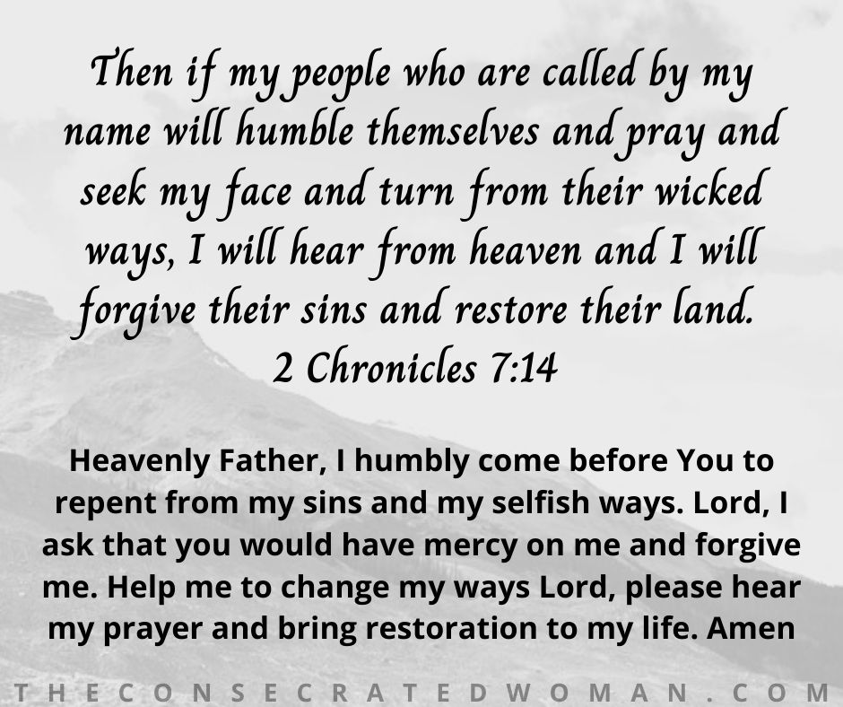 Heavenly Father, I humbly come before You to repent from my sins and my selfish ways. Lord, I ask that you would have mercy on me and forgive me. Help me to change my ways Lord, please hear my prayer and bring restoration to my life. Amen
