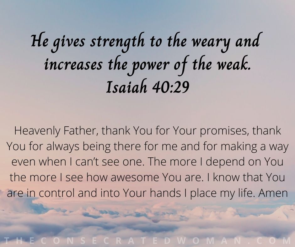 Heavenly Father, thank You for Your promises, thank You for always being there for me and for making a way even when I can’t see one. The more I depend on You the more I see how awesome You are. I know that You are in control and into Your hands I place my life. Amen