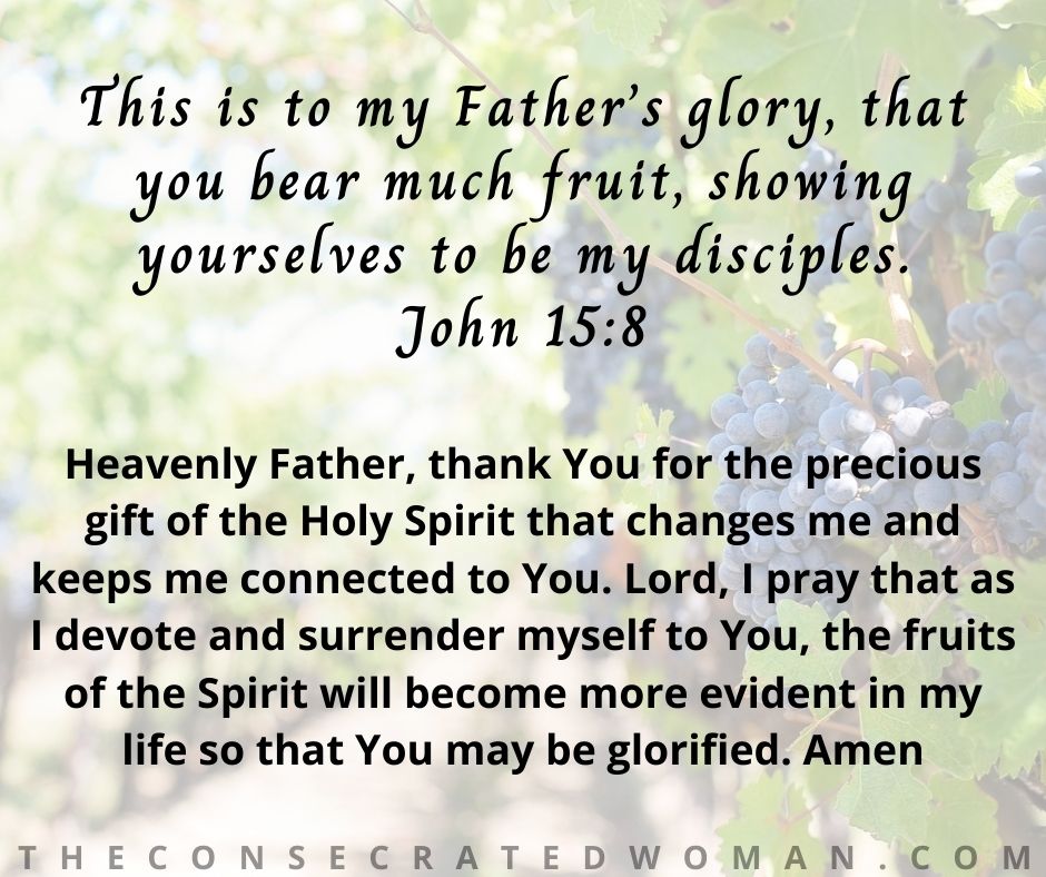 Heavenly Father, thank You for the precious gift of the Holy Spirit that changes me and keeps me connected to You. Lord, I pray that as I devote and surrender myself to You, the fruits of the Spirit will become more evident in my life so that You may be glorified. Amen