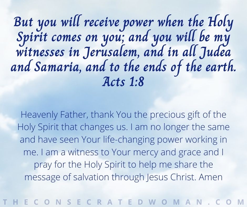 Heavenly Father, thank You the precious gift of the Holy Spirit that changes us. I am no longer the same and have seen Your life-changing power working in me. I am a witness to Your mercy and grace and I pray for the Holy Spirit to help me share the message of salvation through Jesus Christ. Amen