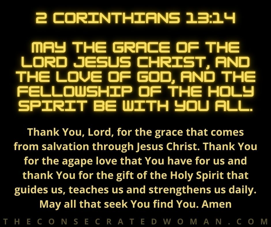 Thank You, Lord, for the grace that comes from salvation through Jesus Christ. Thank You for the agape love that You have for us and thank You for the gift of the Holy Spirit that guides us, teaches us and strengthens us daily. May all that seek You find You. Amen
