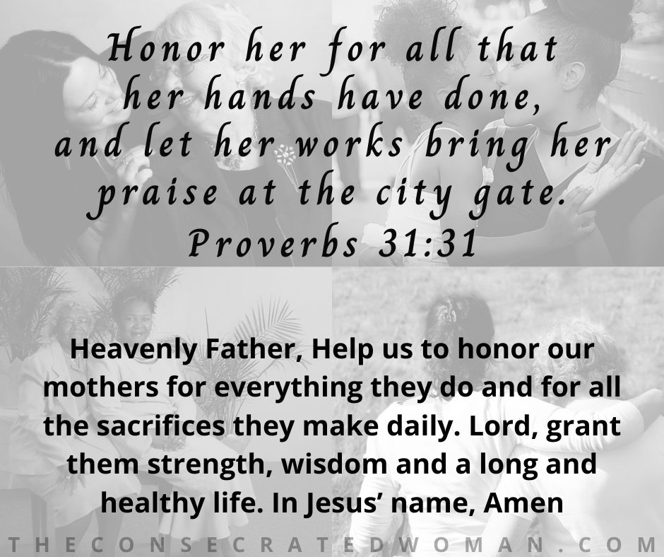 Heavenly Father, Help us to honor our mothers for everything they do and for the sacrifices they make daily. Lord, grant them strength, wisdom and a long and healthy life. In Jesus’ name, Amen