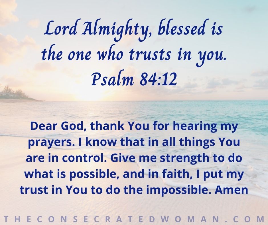 Dear God, thank You for hearing my prayers. I know that in all things You are in control. Give me strength to do what is possible, and in faith, I put my trust in You to do the impossible. Amen