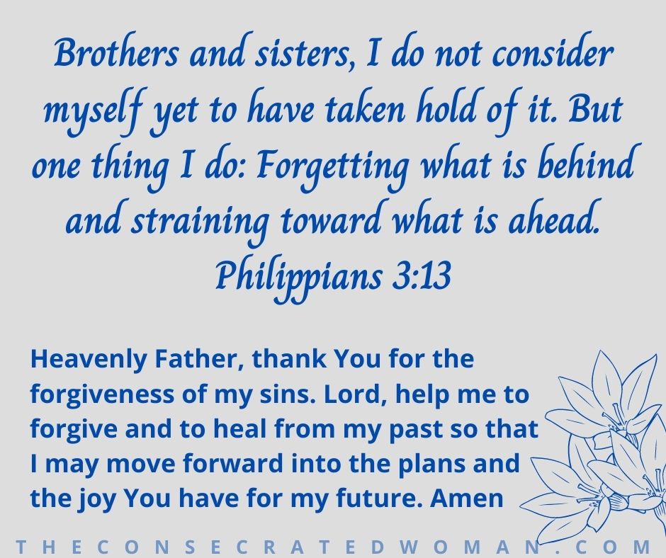 Heavenly Father, thank You for the forgiveness of my sins. Lord, help me to forgive and to heal from my past so that I may move forward into the plans and the joy You have for my future. Amen