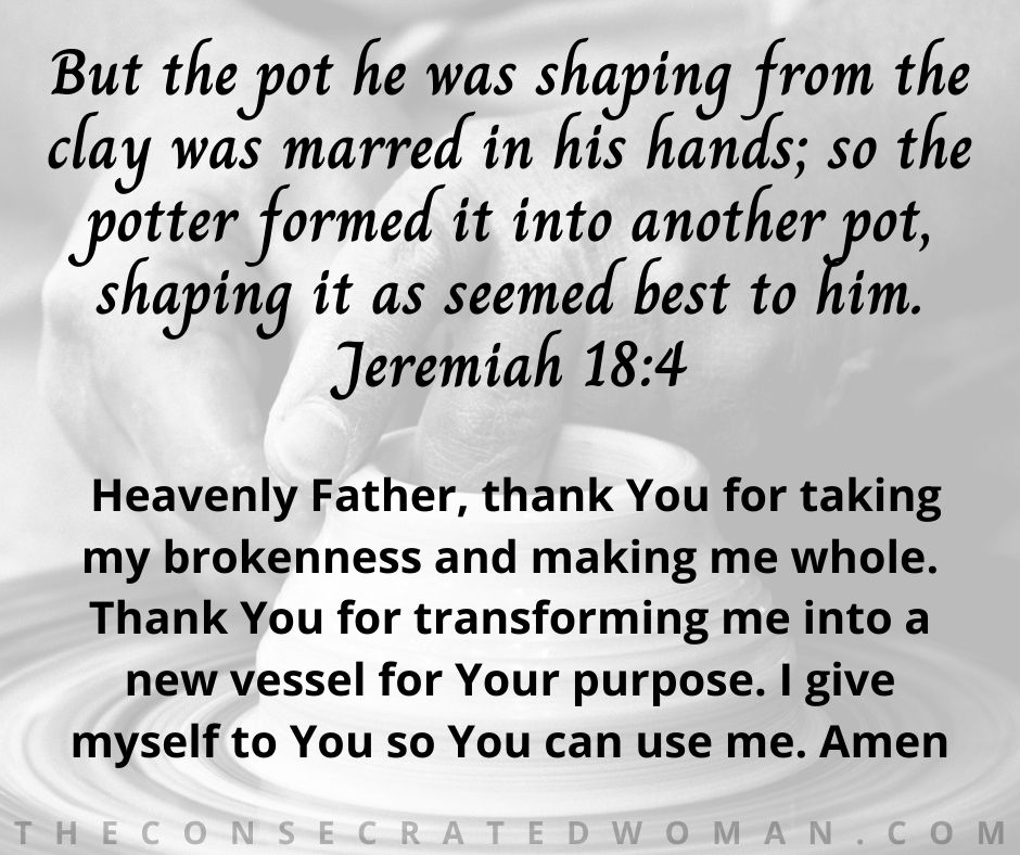 Heavenly Father, thank You for taking my brokenness and making me whole. Thank You for transforming me into a new vessel for Your purpose. I give myself to You so You can use me. Amen