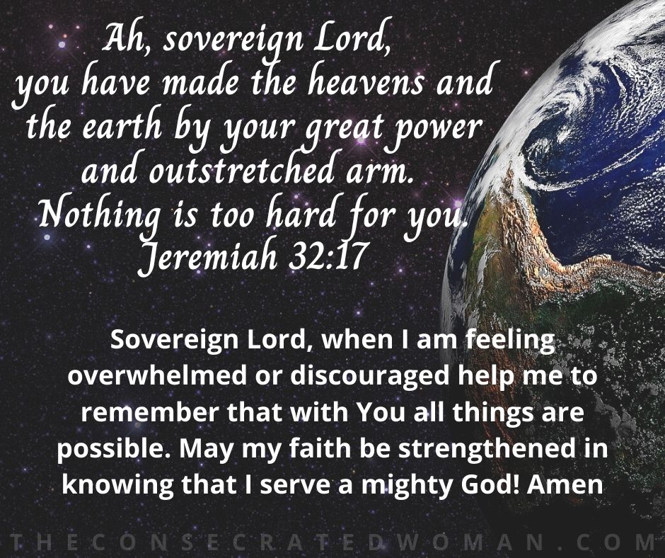 Sovereign Lord, when I am feeling overwhelmed or discouraged help me to remember that with You all things are possible. May my faith be strengthened in knowing that I serve a mighty God! Amen