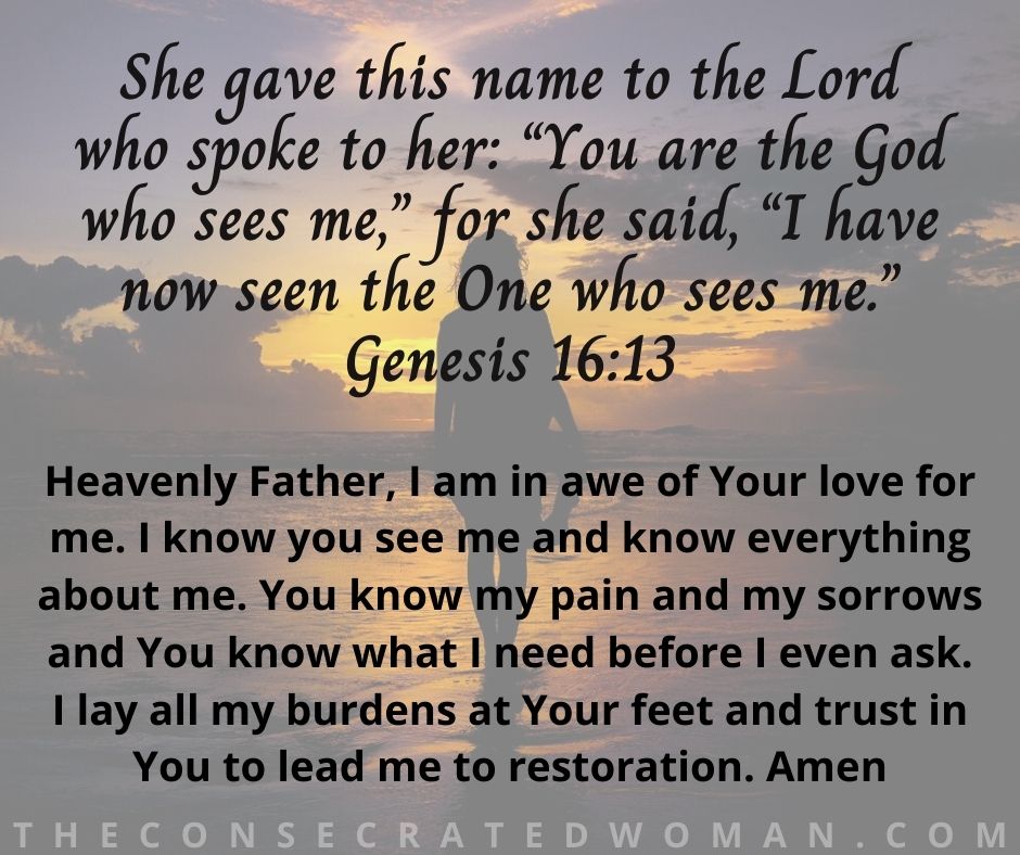 Heavenly Father, I am in awe of Your love for me. I know you see me and know everything about me. You know my pain and my sorrows and You know what I need before I even ask. I lay all my burdens at Your feet and trust in You to lead me to restoration. Amen