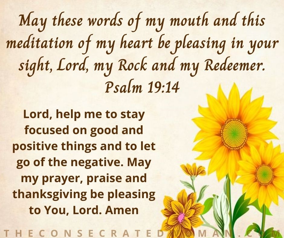 Let your words and thoughts be pleasing to God when you pray, praise and give thanks. Likewise, let your words be pleasing and acceptable to Him in your everyday conversations and thoughts. Fill your mind and heart with positive thinking so there will be no room for negativity or sinful thoughts. Sometimes it’s difficult to stay positive in a negative world, but if you stay focused on the Lord who is your Rock and Redeemer, you can have peace in all circumstances.
