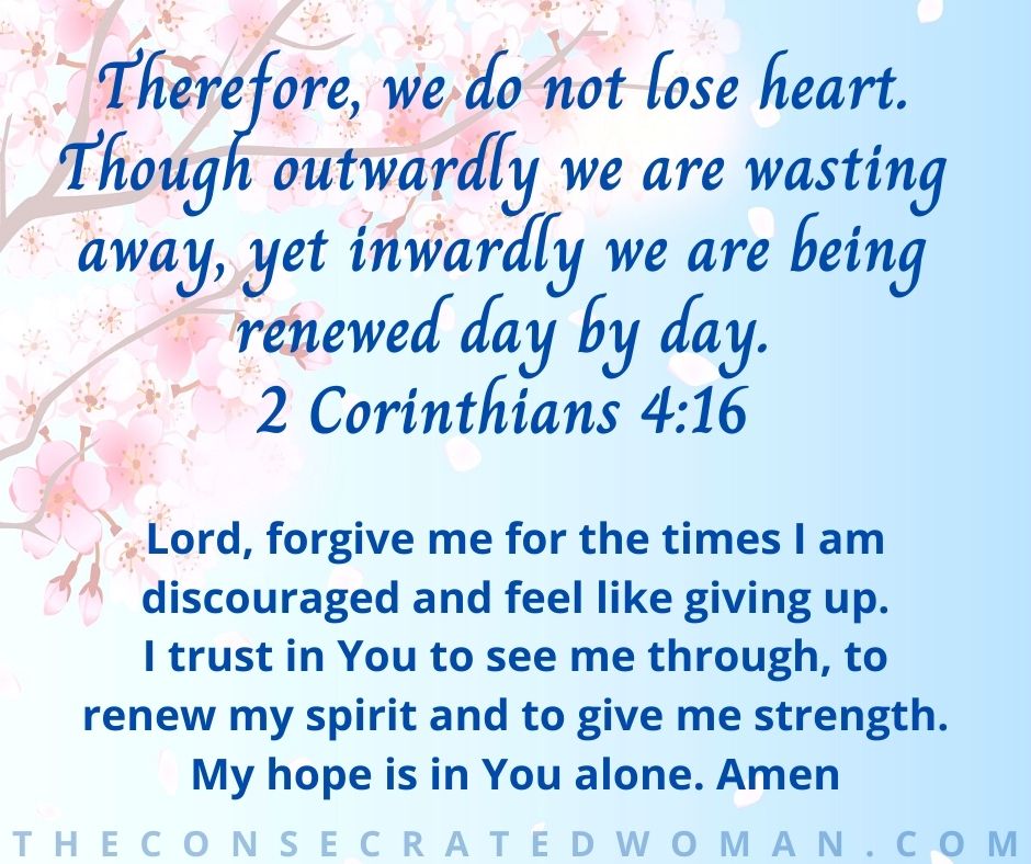 Therefore, we do not lose heart. Though outwardly we are wasting away, yet inwardly we are being renewed day by day.