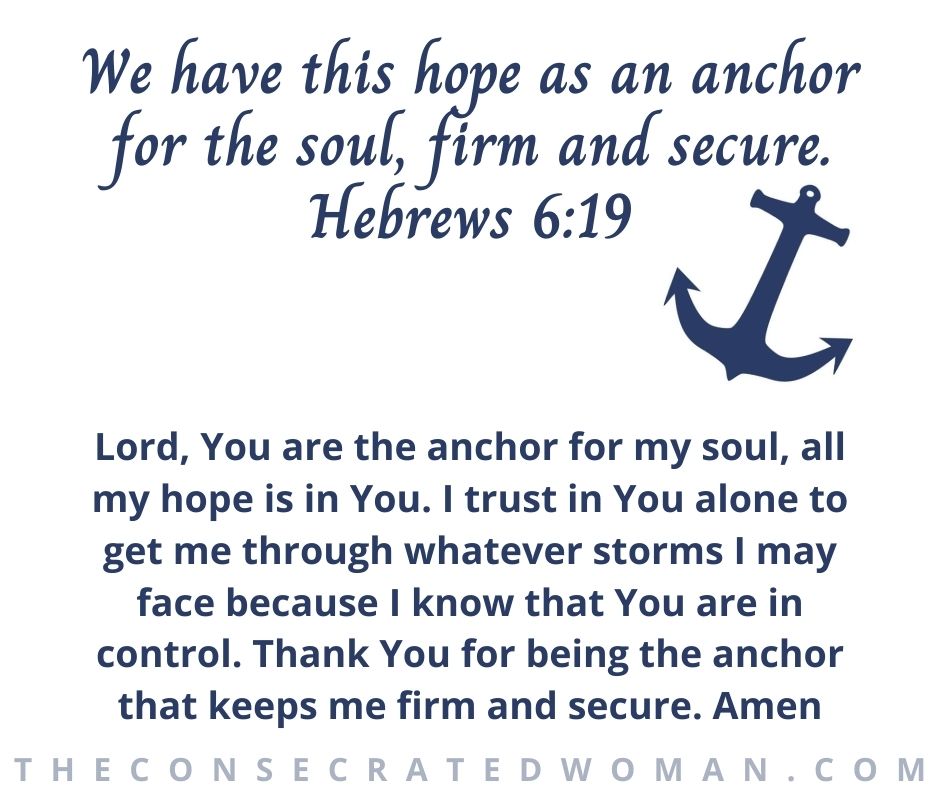 Lord, You are the anchor for my soul, all my hope is in You. I trust in You alone to get me through whatever storms I may face because I know that You are in control. Thank You for being the anchor that keeps me firm and secure. Amen