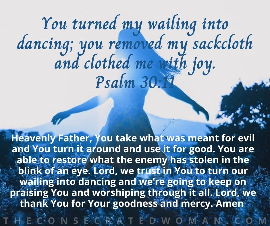 Heavenly Father, You take what was meant for evil and You turn it around and use it for good. You are able to restore what the enemy has stolen in the blink of an eye. Lord, we trust in You to turn our wailing into dancing and we’re going to keep on praising You and worshiping through it all. Lord, we thank You for Your goodness and mercy. Amen
