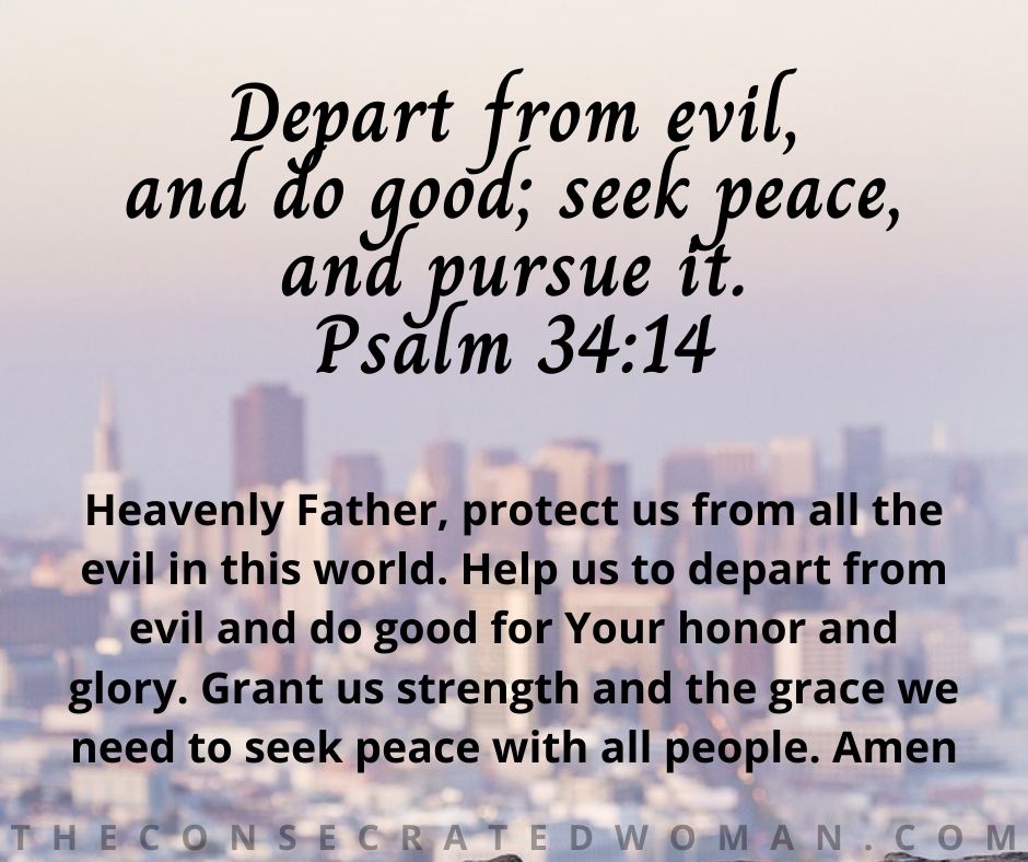 Heavenly Father, protect us from all the evil in this world. Help us to depart from evil and do good for Your honor and glory. Grant us strength and the grace we need to seek peace with all people. Amen