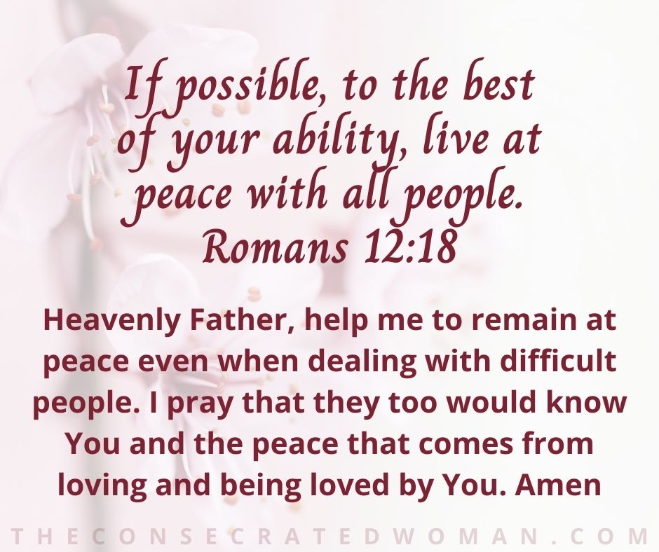 The Bible tells us that we should try our best to live at peace with all people. This includes our family, friends, our brothers and sisters in Christ, the people we work with and as much as possible we should try to make peace with our enemies. We should stand up for what is right, pray for peace and do whatever we can to promote it by living godly lives that honor the Lord. We cannot control what other people do, but we certainly can seek to control our own actions and responses. It may not always be easy, but it will be worth it to try to live peacefully with others, especially those who are difficult to deal with. Do not be vengeful, overcome evil and do your part to live at peace.