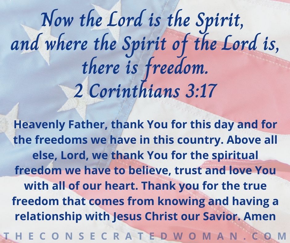 Heavenly Father, thank You for this day and for the freedoms we have in this country. Above all else, Lord, we thank You for the spiritual freedom we have to believe, trust and love You with all of our heart. Thank you for the true freedom that comes from knowing and having a relationship with Jesus Christ our Savior. Amen