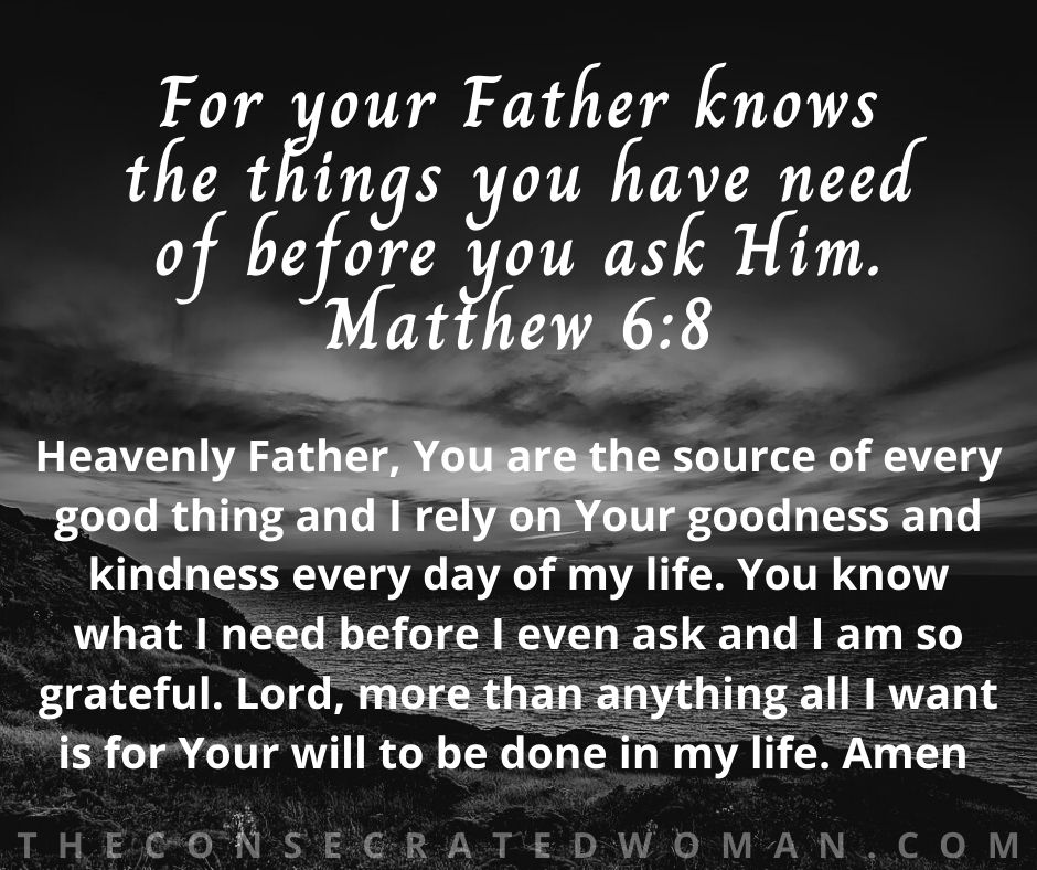 Heavenly Father, You are the source of every good thing and I rely on Your goodness and kindness every day of my life. You know what I need before I even ask and I am so grateful. Lord, more than anything all I want is for Your will to be done in my life. Amen
