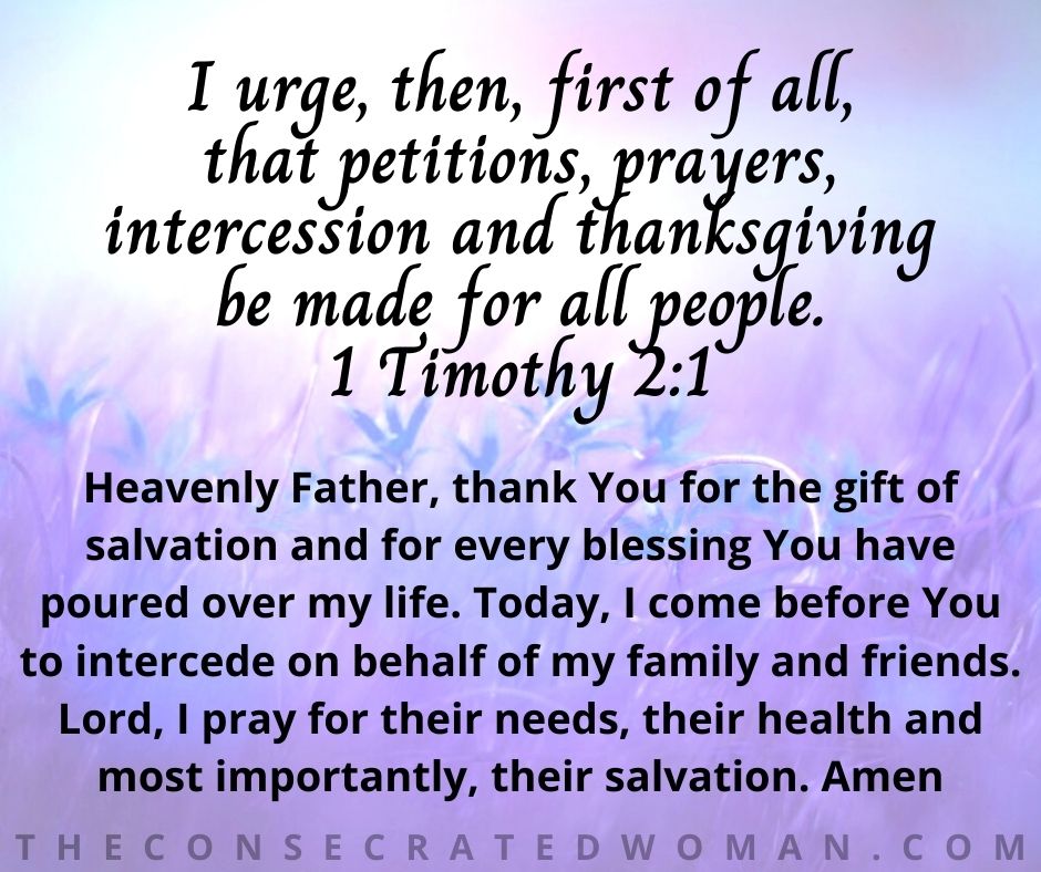 Heavenly Father, thank You for the gift of salvation and for every blessing You have poured over my life. Today, I come before You to intercede on behalf of my family and friends. Lord, I pray for their needs, their health and most importantly, their salvation. Amen