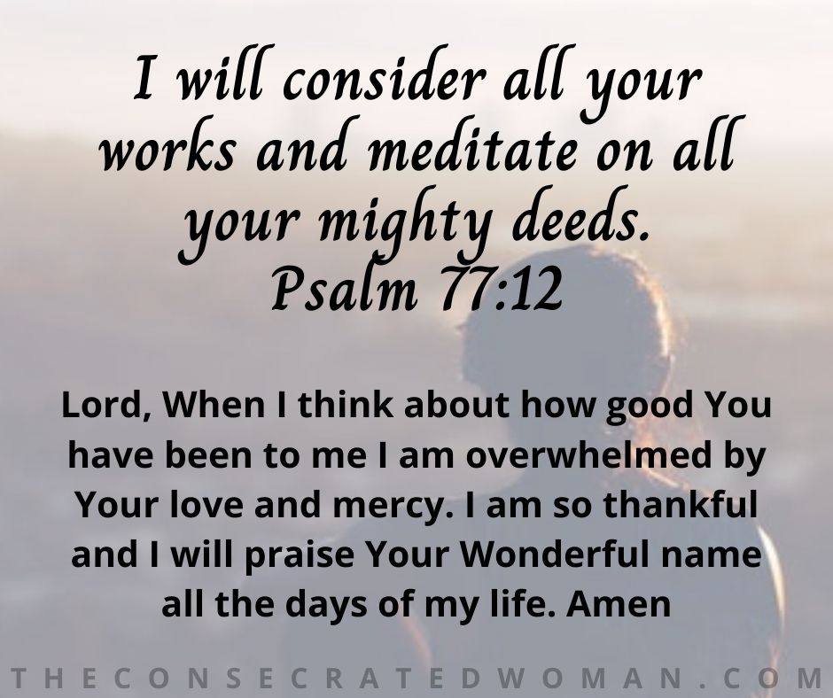Make time to meditate and reflect on all the mighty deeds the Lord your God has done for you and give Him all the glory. Meditate on things that are true, noble, just, pure, lovely, good, virtuous and praiseworthy. (Philippians 4:8) This is especially helpful when your current circumstances are challenging. Thinking about the ways God has been merciful to you in the past will give you comfort and peace as he brings you through your present situation.