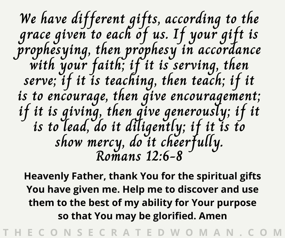 Heavenly Father, thank You for the spiritual gifts You have given me. Help me to discover and use them to the best of my ability for Your purpose so that You may be glorified. Amen