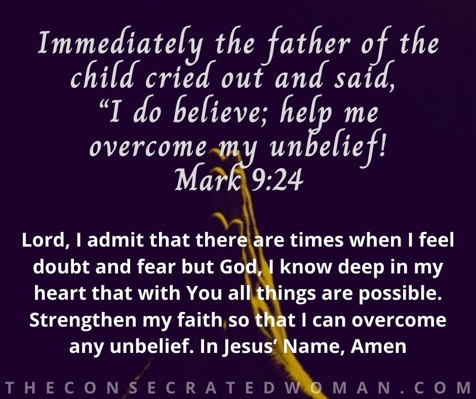Every believer at one time or another has doubts, fear or times when their faith is weak. The enemy will try to destroy your faith by planting seeds of doubt in your mind. But, as long as you still have some faith, even as small as a mustard seed, God will work with what you have. If you still believe, God can change your heart, heal your body or move mountains for you. It’s not about your power or your strength, it’s about having faith in the power of Jesus Christ and believing that His grace is sufficient. When you feel doubt and fear creeping in ask God to strengthen your faith so that you can overcome your unbelief.