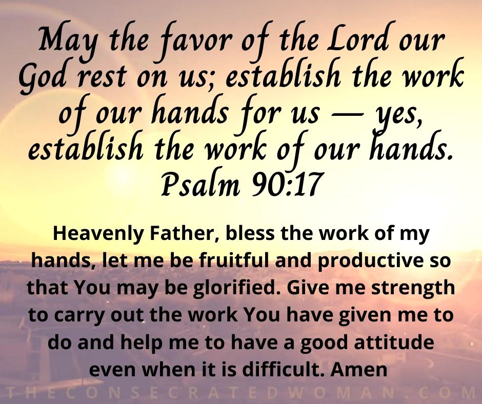 Heavenly Father, bless the work of my hands, let me be fruitful and productive so that You may be glorified. Give me strength to carry out the work You have given me to do and help me to have a good attitude even when it is difficult. Amen