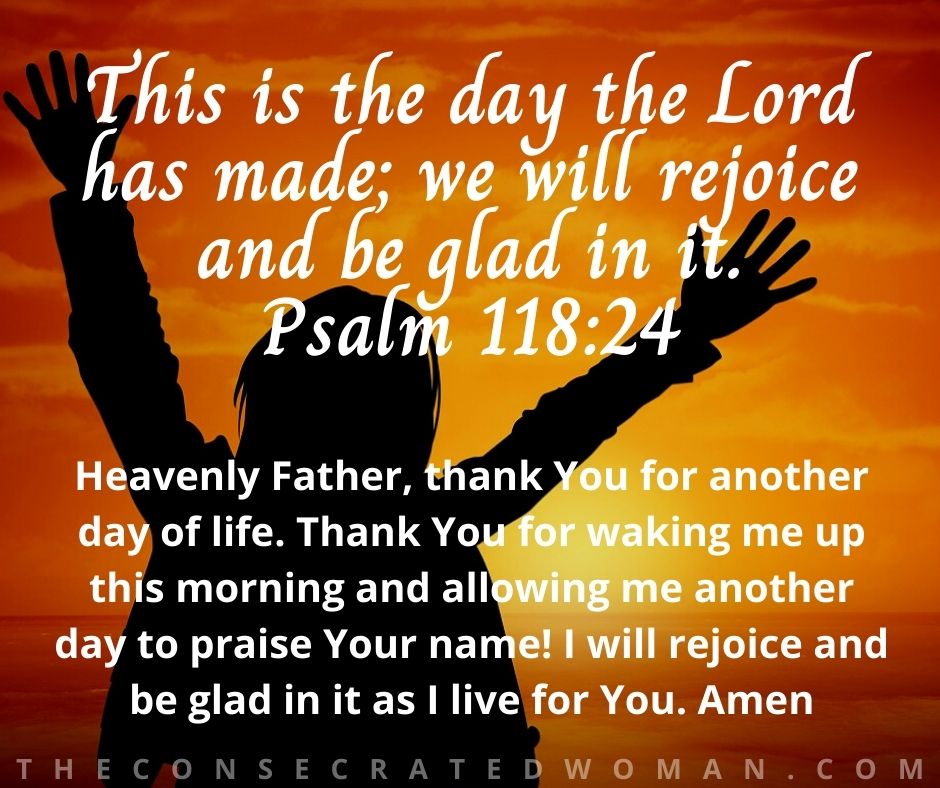 Heavenly Father, thank You for another day of life. Thank You for waking me up this morning and allowing me another day to praise Your name! I will rejoice and be glad in it as I live for You. Amen