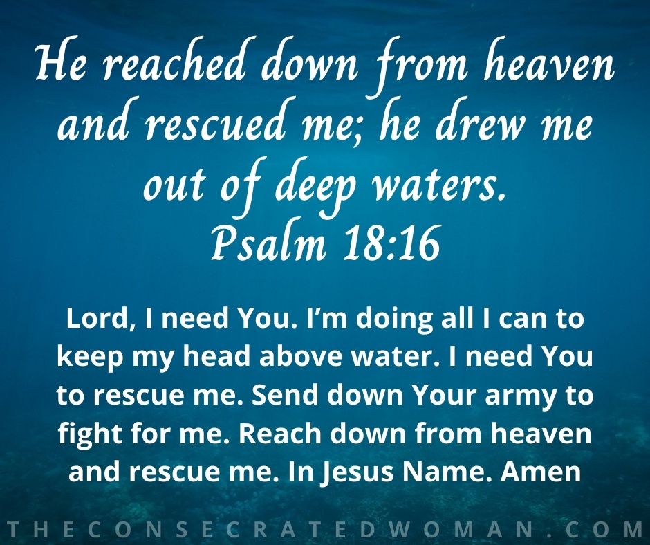Lord, I need You. I’m doing all I can to keep my head above water. I need You to rescue me. Send down Your army to fight for me. Reach down from heaven and rescue me. In Jesus Name. Amen