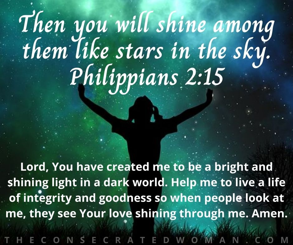 Lord, You have created me to be a bright and shining light in a dark world. Help me to live a life of integrity and goodness so when people look at me, they see Your love shining through me. Amen.