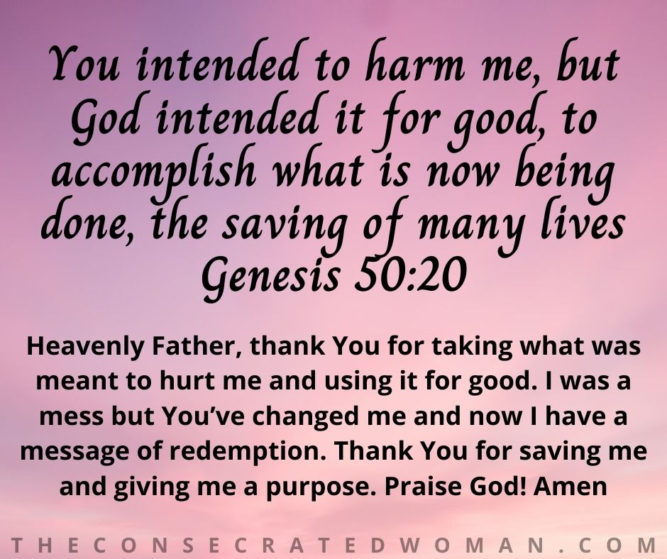 Heavenly Father, thank You for taking what was meant to hurt me and using it for good. I was a mess but You’ve changed me and now I have a message of redemption. Thank You for saving me and giving me a purpose. Praise God! Amen