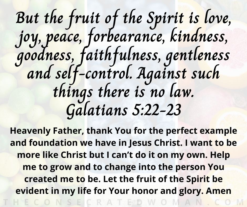 Heavenly Father, thank You for the perfect example and foundation we have in Jesus Christ. I want to be more like Christ but I can’t do it on my own. Help me to grow and to change into the person You created me to be. Let the fruit of the Spirit be evident in my life for Your honor and glory. Amen